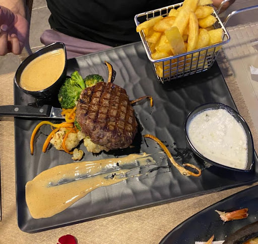 The food was absolutely exceptional. We started with the cheesy garlic bread, which was perfectly toasted and oozing with flavor. For our main course, I opted for the steak with peppered sauce, and it was cooked to perfection.