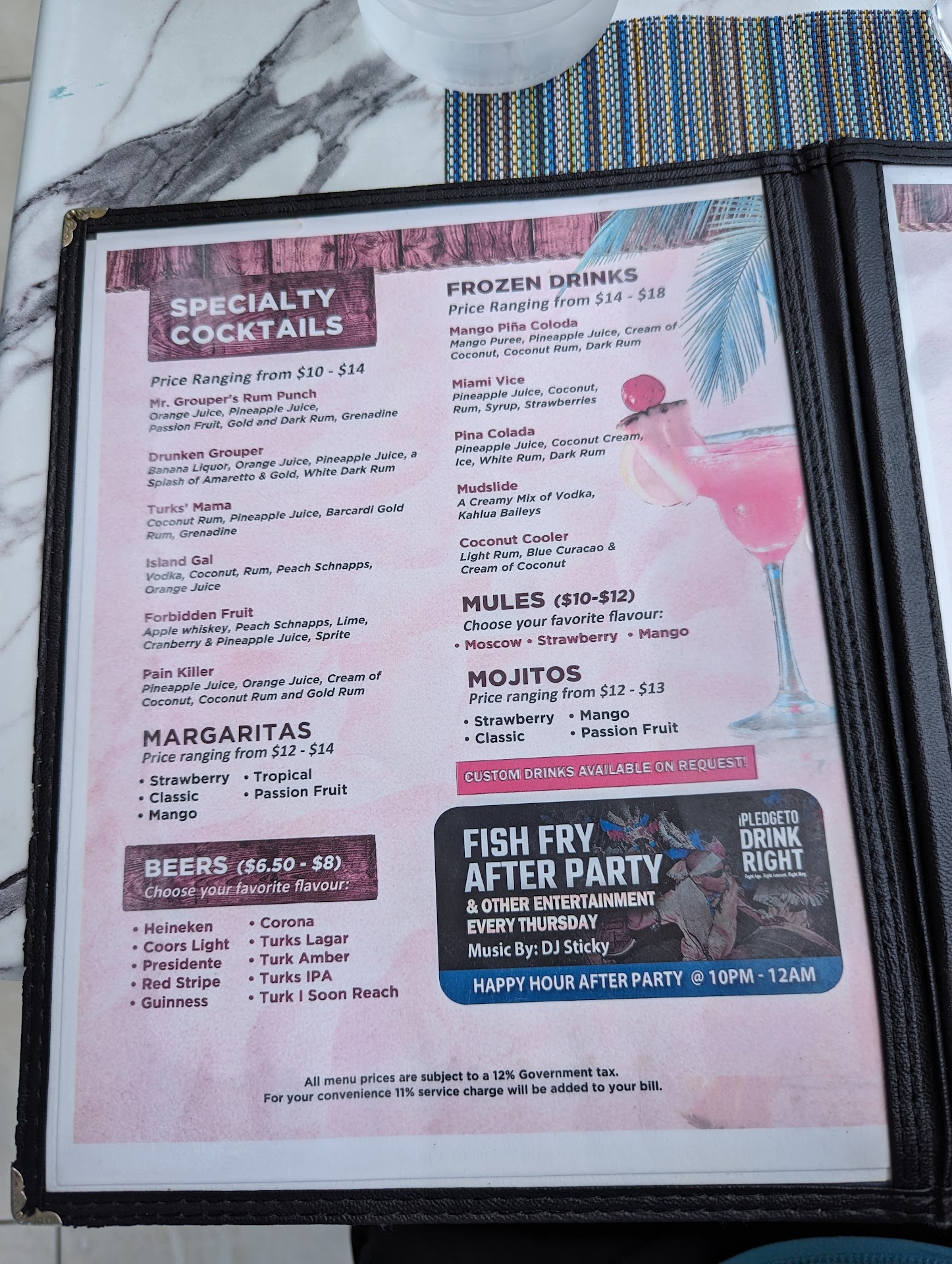 Adam (Bartender/Server) SAVED this review! He solely gave us a renewed hope that our food experience could be salvaged with another visit. He suggested the Fried Snapper next time. He was smart, knowledgeable, quick & efficient, personable and friendly. The other staff members were gracious & helpful but Adam stood out! Otherwise, this review would be a 1.5-2 based on the food. The drinks: Rum Punch & the Mango Pina Colada were good but both needed an extra shot to be NICE! Bambarra Rum used is a bit on the light side, but it has a good flavor, like candied sweet potato spices. The Bambarra wings are a DEFINITE! The Blackened Grouper wasn't cooked through & is battered & pan fried versus a true Blackened sear or grill (creole style.) The Macaroni pie/bake was HORRENDOUS!!!! Don't know who made it but it looked as if toddlers played in it. It was dry, overcooked, NO FLAVOR & COLD, not even lukewarm. IT SHOULD NOT HAVE EVER been served to paying customers! It was sent back along with the bland steamed veggies. Maybe this was an off-day, which Adam assured us it was. He apologized profusely. Today's food is a VERY POOR representation of THE MOST highly recommended restaurant since we've arrived, by locals and other vacationers. Also had the miniscule grilled grouper sandwich, which should be on the Kid's menu. The fries were paltry! Horribly cooked, like leftover & left out McD fries. They were also returned. We opted for Grilled Grouper to replace the un-cooked Blackened but it came pan seared versus grilled. We just kept it because we were starving & had saved our appetite for this experience turned nightmare. We also opted for coleslaw, which might as well had been soup! It had good flavor but DROWNED in watery sauce. The oil needs to be changed more often. Tables, menus & bathrooms CLEANED better! We also had to return a glass due to a lack of cleanliness. It still had lip prints. Overall, HIGHLY DISAPPOINTING! Photos not worth posting but...