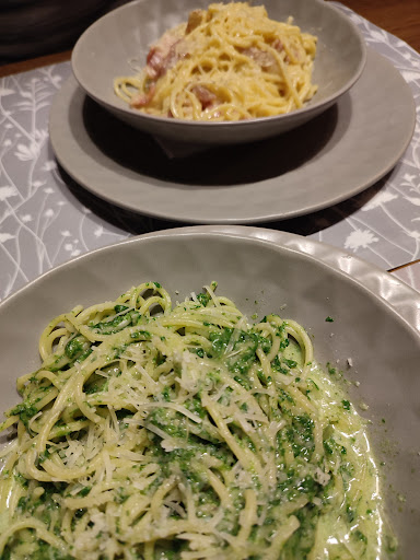 Пішли сім'єю відсвяткувати день народження. Обрали заклад, бо в п'ятницю жива музика, а батьки вже коштували пасту з морепродуктами і були в захваті. Інтер'єр приємний, хоча штучні папоротники нагадують дитячі кафе 90-х. Атмосфера приємна, музика сподобалася. Але... Замовлення чекали годину. Зголодніли страшенно. Напої давно випили, батьки запевняли, що все так довго тому, бо пасту роблять спеціально для кожного. Терпляче чекали. І дочекалися. Паста була схожа на макарони із магазину (хороші макарони твердих сортів, але аж ніяк не хенд мейд пасту) і це ще нічого... Але все було ДУЖЕ гостре. Зауважу, що нас про це не попередили. І паста, яку коштували батьки минулого разу була зовсім не така. Від того, щоб покликати офіціанта і попросити замінити блюдо витримало три речі: офіціант на очі не попадався (щоб взяти чек, довелося йти на барну стійку і чекати хвилин 10), голодними чекати ще годину, вже не було змоги і чесно кажучи, остаточно псувати свято не хотілося. Офіціант не поцікавився як нам страви, а коли сказали, що було дуже гостро навіть нічого не сказав. Коли хлопець зачепив стопку меню і вони усі впали на підлогу і пролежали хвилин 5,то їх підняли і поклали назад, а потім подали на стіл гостям якраз туди куди ставять їжу і це в часи карантину. Приїхали додому - болів шлунок від надто гострої їжі. Думаю, зможемо знайти інше кафе із приємною атмосферою, але смачною їжею і...