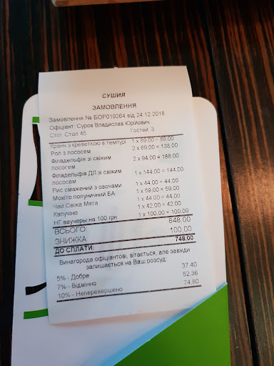 Read moreБули в Сушия кілька разів, все смачно, персонал привітний, ціни адекватні, питань немає. Називається сильно в них повірили і замовили доставку на 8 березня. Розуміючи, що в свята велика загруженість, домовились за замовлення на доставку о 13 годині дня, планована доставка на 20:00. Ще й перепитали у оператора чи можливо замовити саме на цю годину і нас запевнили що все буде окей. Що ж… зараз 22:00. Замовлення немає, додзвонитись майже не можливо. Телефонували рази 4 і питали як це так. Нам кожного разу відповідали 30-40 хв і замовлення буде. Саме не приємне, що замовлення завчасно оплачене і це було на подарунок сімʼї, так як я знаходжусь в іншому місті. Звісно нас ніхто завчасно не попередив, що таке може статись і навіть не подзвонили ні разу за дві години. Телефонуємо лише ми, щоб почути те...