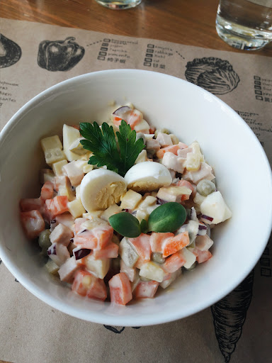 Read moreГугл нас чуток покрутил, т.к. там дворы и почти всюду перекрыто, открыт один проход - к языковой школе. В самом здании школы и находится заведение, на первом этаже. Есть столики на улице. Внутри уютно, правда место в уютных бордовых креслах рядом с дверью на лестничную площадку (и видимо на кухню) портит открытая дверь, через нее дует. Заказали вегетарианское оливье ( с веганской колбасой), фреш, завтрак "яйца Бенедикт". В оригинале в блюде "яйца Бенедикт" должен быть бекон или красная рыба. Кстати, на фото блюда в меню, красная рыба была изображена. На деле принесли тосты с яйцами пашот (1 яйцо не получилось пашот, а переварилось, на заметку повару) и политые соусом голондез. Оливье очень понравился, кофе был вкусный, фреш очень хороший, сладкий. А вот "яйца недоБенедикт" не понравились, поэтому минус одна ☆. Обслуживание вежливое, работники...