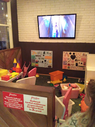 Замовляли піцу Цезар, від якої просто слинки текли, вона тає у роті . Тісто ніжне,тонке, інгредієнти свіжі , гарна подача. Але через великий потік клієнтів офіціанти були трохи розгублені і не послідовно давали замовлення на кухню, тому одну піцу ми чекали близько години, бо про наше замовлення просто забули. Тут адміністрація мала б скерувати персонал, для більшої організації. В залі на першому поверсі є кімната для мам - пеленальний столик , серветки та базові засоби гігієни для дітей. Куточок розваг для дітей з цікавими іграми...