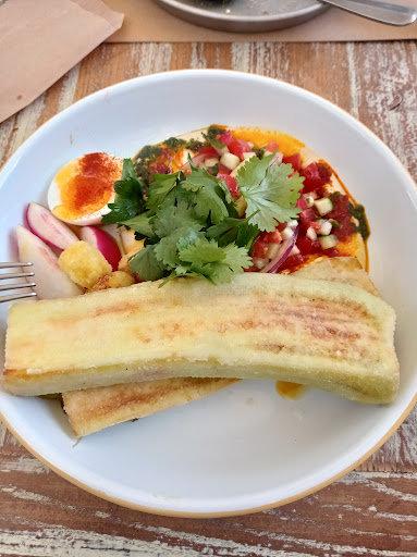 Suitable place for vegetarians. We had the shakshuka, caramelized carrots, and grilled eggplant (that looks like zucchini?) on plate. Maybe it would have been smart to order some pitas with the last ones because it was maybe a little too low carb for our liking. The lady kept calling the eggplant dish "sabich" which I thought was a sandwich but I'm still learning about Israeli food We had a small bubbly water with this and paid €20 in total, which is not great value for money. For reference, at bessarabka market you can get two vegetarian falafel/vegetable rolls that will get two people full with two ayran on the side for €5. The only difference is that at Adelle you can sit down. Not sure if that's...