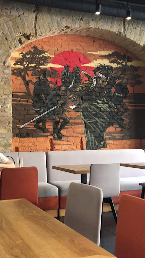 Цены действительно доступны, как для заведения в центре, кроме того есть счастливые часы, что делает это заведение идеальным для похода туда в обед. Почти каждому блюду есть овощная альтернатива, будь то ролл или рамен, это большой плюс. Окружение там действительно приятное и стильное, много деревянных деталей, интересные светильники, все цвета спокойные и сочетаются друг с другом, цепляют глаз нарисованные на стенах самураи. Острый рамен (нигде такого вкусного не пробовала раньше) и рисовые чипсы, которые я там отведала были действительно замечательные, травяной чай тоже порадовал. Но был один очень жирный минус, который просто свёл практически всё на нет. МУЗЫКА. Ужасная клубная музыка. Громкая, мерзкая, раздражающая и не дающая спокойно поесть музыка. Не знаю, возможно её не всегда там проигрывают, но весь тот час, что я там была их плейлист составлял полностью из клубняковых битов. КАК МОЖНО ПОД ЭТО КУШАТЬ? Особенно был расстроен мой парень, который из-за этого ужаса не смог притронуться к еде, ну хотя бы её завернули с собой. Ну ладно, следующий пункт. Столик на двоих, за которым мы с моим молодым человеком сидели, еле помещал на себе две тарелки с основными блюдами, две чашки с чайничком и небольшую тарелку рисовых чипсов. Пространство было сильно ограниченым и если бы я или мой парень заказали бы что-то ещё, то ставить его было бы просто некуда. Да и куда? На уже запачканное меню аля подставку под тарелку? Я думала, это только Мак и Пузатая хата на свои подносы кладёт. Выглядит, откровенно говоря, не очень. Да и диваны им не мешает хорошо с пятновыводителем почистить. По ним видно, что пятна достаточно старые, но всё равно была легкая тревога, что я запачкаюсь.