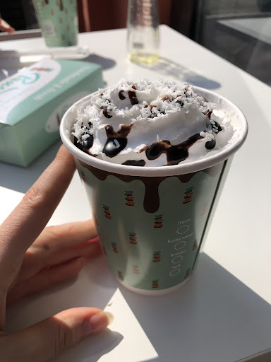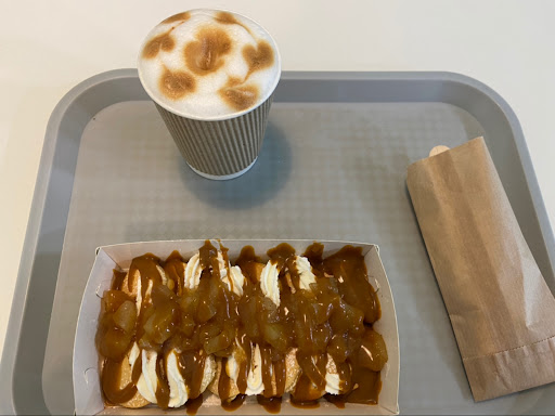 It is lovely place! Here are you can order a plate of small pancakes with different toppings! I got pancakes with threes different types of cheese with arugula on top. This is supper tasty. Pancakes themselves are not too sweet or salty. My friend ordered pancakes with Nutella and banana on top. And yes, we ordered supper sweet and tasty two snickers’ and one bounty’s lattes. I will definitely come back to try crepes, that are available in...