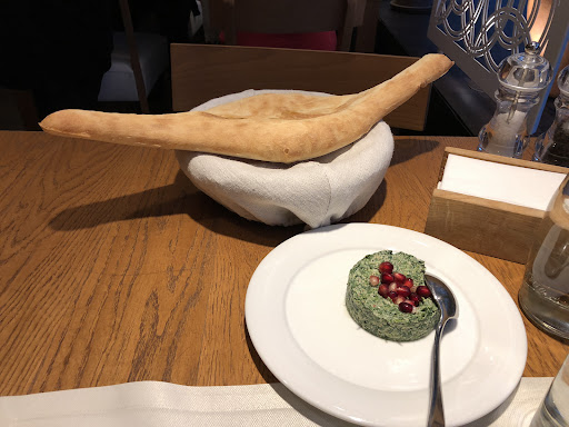 Read moreFriend suggested me to eat here. As a tourist in Kiev. The interior design is so modern and well done that makes you think it’s some kind of Michelin restaurant. They have in the middle a very big fire place which made my dinner very atmospheric, burning wood smell! The restaurant is being used for large events I guess, because as I entered there was some kind of large familly reunion going on. The waiter serving me did not speak english, so do not ask for reccomandation. Instead use their english menu. I ordered 4 vegetarian dishes: A spinich apetizer, salad, beans and veggie dumplings. The restaurant is Georgian by the way, so all courses were with that specific. For all 4 dishes I have paid 650 uah. Portions were okay sized....