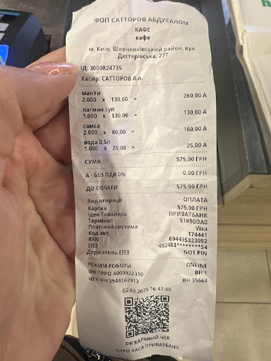 Read moreБули в закладі на Дегтярівській, просто лайно! І все дякуючи персоналу. Офіціантка темненька повна така, вони працюють без бейджиків тому імені цієї особи написати тут не можу. Обслуговування на дні. Привітності 0, веде себе так наче ми їй щось винні, ми приїхали конкретно за самсою в тандирі, а отримали звичайну в слоєному тісті. Ні під сказати нічого по меню. Все як намальовано відповідь на всі запитання. Офіціантка сказала що ви не уточнювали яку ви хочете, в меню не прописано що їх декілька видів. Звісно ми не уточнювали бо на фото самса в тандирі, на стіл всю іжу швиряла . На питання де вбиральня відповідь вбила «там» де там ??? Самі шукайте називається. До слова у вбиральні немає навіть мила для рук. Розрахунок, йдеш сам кажеш що замовляли , і розраховуєшся . Я працюю в сфері обслуговування вже більше 10 років, але з таким сервісом я не стикалась ніде. Звичайна столова , в яку більше ми не зайдемо ніколи. За жодною іншою адресою. І за це можете подякувати своєму...