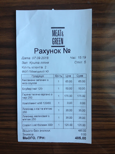 Еще до поездки в Луцк читала отзывы про кафе и рестораны, и решила обязательно сходить в Meat&Green. Но по времени не успели, поэтому очень расстроилась. И на обратном пути из Львова в Беларусь мы специально заехали сюда пообедать, потому как гештальт надо было завершить. Отличная парковка во дворе. Просторная, выложенная плиткой (ведь мы так устали от ужасной львовской брусчатки), аккуратная. Прям по-белорусски хорошая. Есть столики на улице, в зале и на застекленной террасе. Мы выбрали последний вариант. Людей почти не было, можно было сесть у панорамных окон с приятным видом на внутренний дворик. К сожалению, комплексных обедов нет в дневном меню. Долго не могли остановиться на чем-то одном. Конечно, хотелось стейк, но время не позволяло долго ждать (к тому же нам сказали, что средний выход стейка ок. 600-700 гр!!! это перебор, конечно). Остановились на теплом карпаччо (потому что у нас в ресторанах я нигде такого не встречала), баклажанах ( потому что я их обожаю), спагетти с митболами (потому что все, что связано с макаронными изделиями обожает мой муж), а на десерт блубери пай (потому что это была аллюзия к американским десертикам). Официантка была очень приветливой, подсказывала, помогала с выбором, советовала. Все быстро приносила и появлялась тогда, когда было нужно. В дополнение к заказу принесли хлебушек с вкусным маслом с травами (это комплемент от заведения, который не входит в счет). В качестве напитков мы выбрали лимонады: киви с мятой и малиновый. Конечно, малиновый был вкуснее ) Карпаччо было очень вкусным. Тонкие ломтики говядины просто таяли во рту, а обилие сыра приятно тянулось за каждым кусочком. Я, правда, не люблю запеченные помидоры, но тут чери были вполне съедобные даже для такой привереды, как я. Спагетти мой муж уплел сразу же! А митбол (т.е. фрикадельку) удалось и мне попробовать - очень мясная, довольно крупная, ел бы и ел. Когда принесли баклажаны, я не поверила своим глазам: это было 4 куска! (т.е. два целых овоща). Но они были запечены с соусом до нужной степени (мягкие, но не превратившиеся в кашу).Пальчики оближешь. От пирога я ожидала чего-то другого. Но просто потому что в моем представлении "блубери пай" - это закрытый песочный пирог с начинкой из ягод. А это была пирожка, но тоже с ягодами, и тоже вкусная. Общий счет вышел на 485 гривен + чаевые. Наверное, по украинским меркам это дороговато. Но у нас в Гродно за эти деньги мы бы в лучшем случае по салатику съели и выпили по лимонаду. Заключение: ни капли не жалею, что пришлось свернуть с трассы по дороге домой и потратить часа 2 на все про все, т.к. это один из лучших ресторанов, где мы были за эту поездку по Украине (наравне с Короной Витовта в Луцке и...