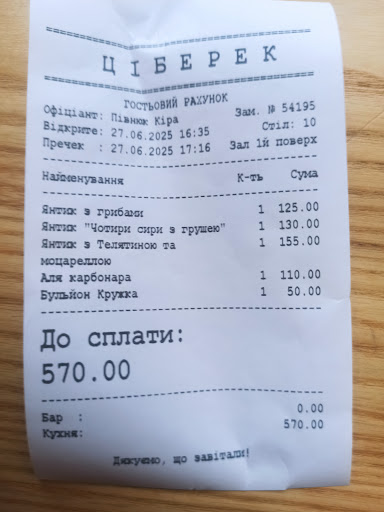 Read moreПрогулювався сьогодні по місту, змерз трішки та думаю, куди-то зайти) Якось завжди «Ціберек» обходив мене стороною, але не сьогодні) Розпочну: Прийшов сам, офіціант хлопчина мене любʼязно зустрів, та провів до столика) У мене була маленька проблема, телефон сідав, і був лише відсоток, про що я сповістив. І чудо, мені відразу приносять павербанк на столик, повільний правда, але все ж) Відразу якась приємність відчувається) Офіціантка підійшла, відразу прибори, водичку та антисептик подала, останній дуже приємний та у фірмовій тарі) Погортав меню, зробив замовлення. Принесли швидко 🔥 По стравах: смачно, ситно, гарна подача, оформлення. Великий український сніданок просто зайшов на ура, смачно, душевно, яскраво, дуже сподобалася подача. Також замовив ціберек з свининою та яловичиною. Якби знав, що він такий великий, обмежився лише б першою стравою, яку замовив вище:) Як наслідок, відпочивав повільно та шукав місце для чебуреку) Трішки несподіванкою було те, що заклад працював до 21 години, мені це повідомили, а мій ціберек ще навіть не був спробуваним:) Прийшлося в темпі вальсу куштувати його, і звісно, увесь я його не подужав, навіть часу не вистачило:) Сам чебурек досить смачний, тісто було мʼягким та приємним на смак, багато начинки. Тому мій гарний вечір вдався ще яскравішим:) Дякую закладу за приємну атмосферу, смачну кухню та гарне обслуговування милими офіціантами:) Обовʼязково навідаюся уже з друзями) Чекайте в гості знову) Удачі в...