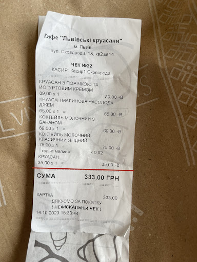 Дуже люблю львівські круасани, але саме цей їх заклад - жахливий. Раніше, у зв'язку з тим що знаємо та любимо цю мережу, робили поправку на вітер, та останній наш візит остаточно зіпсував думку про власників та персонал. По-перше: стикнулись з тим, що дівчинка-адміністратор скандалить з персоналом при відвідувачах - гучно, грубо. Дуже сумніваюсь, що бачити таке зранку цікаво вашим гостям. По-друге: при тому, що дуже люблю ваш чай, напої подаються холодними і чай не заварюється. По-третє: коли в мене важливий сніданок і я прошу свіжі круасани, а дівчинка спеціально, попри всі мої прохання подає черстві і доводить, що вони спечені о 8:30 - ми не вперше у вас і знаємо, що не так. Випадки зі свіжістю круасанів неодноразові, стикались з цим вже разів 5