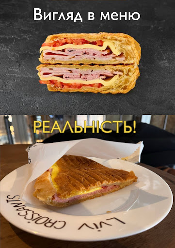 Тепер основна моя претензія, взяв капучино із круасаном з вишнею, номер мені не дали для столика, я сам пішов питати коли буде круасан, сказали що він вже давно готовий. Далі, подали круасан, при тому що я сиджу в закладі, не на тарілці, а в мішечку і вертикально, відповідно вся начинка просто вилізла. Далі сам Круасан, він просто не смачний, таке відчуття що він вчорашній, він також був деформований.