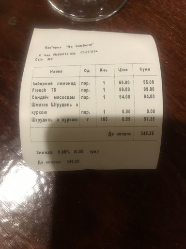 Я обожаю кофе и всегда перед тем как сделать заказ, делюсь с бариста своими предпочтениями относительно вкуса и температуры напитка. В этом заведении к моим просьбам отнеслись наплевательски и принесли кислый кофе аргументируя тем что: «это же 100% арабика». 🤢 Стакан воды вместе с кофе здесь не приносят, поэтому яркий вкус этого напитка сохранится у вас на языке ещё долго. Касательно десертов: если Вы заказываете сладость ориентируясь на вес, указанный в меню, спешу Вас огорчить. Официант отрезает кусок пирога/штруделя на своё усмотрение. Соответственно сумма Вашего заказа может стать сюрпризом до получения чека. К примеру наш с парнем счёт за 2 кофе и 2 штруделя обошёлся порядка 460 грн