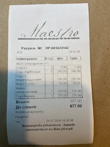 Read more7.07.2019 имели несчастье зайти, вместе с дочкой , пообедать в кафе " Маэстро". Заказали суши "Филадельфия" (классические) и молочный шейк для меня, лимонад и злополучное блюдо- телятина ,фаршированная сыром, для дочки ( она беременна, это уже хорошо заметно). Мой заказ принесли быстро, вкусные суши, прекрасный шейк, никаких претензий и .... дальше потекло время ожидания телятины. Все другие посетители давно получили свой заказ, некоторые поели и ушли( хотя пришли позже нас). Через 40 минут , я подошла к барной стойке ( официантов и другого персонала в зале не было, только бармен)и попросила позвать нашу официантку или администратора чтобы спросить как долго ещё ждать, дочка очень хочет есть. Появились две девушки официантки, промямлили что блюдо готовится долго и они сейчас узнают. Спокойным тоном я задала встречный вопрос: почему о времени приготовления не говорят при приеме заказа? Но вразумительного ответа не получила и через 2 !!!минуты о чудо!!!блюдо принесли. Вкусно, претензий никаких. Моя дочь съела половину телятины , грамм 120, вторую часть, примерно столько же попросили с собой. Упаковали и пакет швырнули!!!!! Я не утрирую на стол....Хочу спросить администрацию кафе: почему за свои деньги ( 410 гривень) мы получили хамство , испорченное настроение и желание написать этот негативный отзыв ( делаю это впервые в жизни)???? Ваш персонал не дорожит работой или вам не важна репутация???? Надеюсь получить...