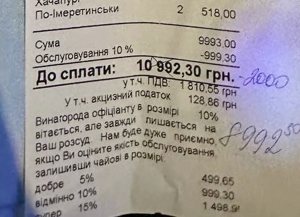 Розрахунок лише готівкою. Мене не можуть ставити перед фактом, як мені розраховуватись. Максимум можуть сказати, що їм так краще, особисто мені – ні. Я готівкою не користуюся вже не один рік. Коли я сказала, що маю гроші на карті, адміністратор почала брехати, що не працює термінал. Тобто за каву ми могли розраховуватися весь вечір картою, а за банкет ні? Довелося переказувати гроші на особисту картку працівника. Ресторан не хоче сплачувати податок.
