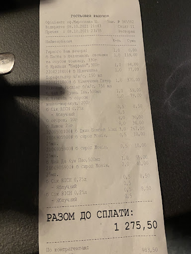 A nice place to spend with friends, the service is fine although in some moments I would like it to be faster. On some occasions I went on Wednesdays at night why there is salsa music but honestly the music is not of that style proper, I would like the styles to vary more. In my opinion I feel that it would attract more attention if they put Latin music like reggaeton, merengue and salsa (I know that style of music because I am from Ecuador) and I know that here in Ukraine the music in Spanish or Latin in general calls Much attention for its rhythm...