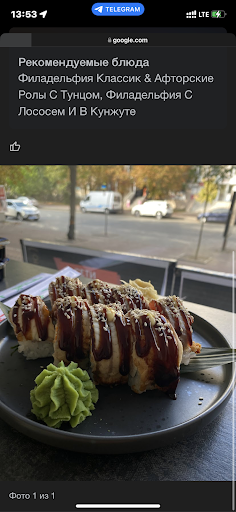 Тільки отримали та скоштували. Доставка - таксі, швидше заявленого часу. Подача - все дуже акуратно (окремі картоні бокси для кожної страви) - навіть рисинки не впало. Якість : по-перше, це дуже смачно, по-друге - достатньо того, що "по-перше")). Відчувається свіжа риба, рис не розвалюється, суші тримають форму. Фото не зробили - не встигли)). Соус - окрема пиалка для кожного. Окремо хочу відмітити васабі - вірна консистенція, гострий та приємний на смак. В цілому - дуже рекомендую! Головне - тримайте ту саму якість сервісу та...