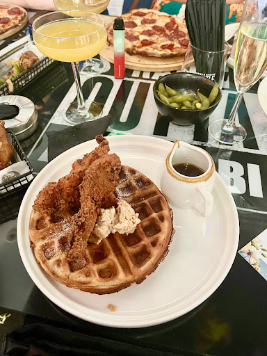 The food was table service which was a bonus! The starters were all super yummy & you get to choose 1 main each; I went for the chicken & waffles, best choice in my opinion 😍 I couldn’t finish the whole waffle, but the chicken was so juicy and fresh that I had to get that down me!