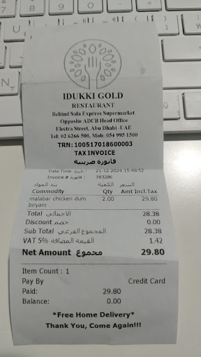 It is with great regret that I write this feedback about my recent visit to Idukki Gold Restaurant, Abu Dhabi Downtown, on 21st December 2024, between 2:45–3:00 PM. My friend and I were looking forward to a pleasant dining experience, but what unfolded was far from satisfactory.