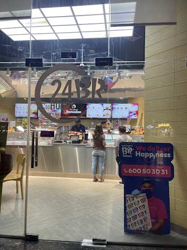 The interior of this Baskin Robbins ice cream shop is with a playful and inviting atmosphere.