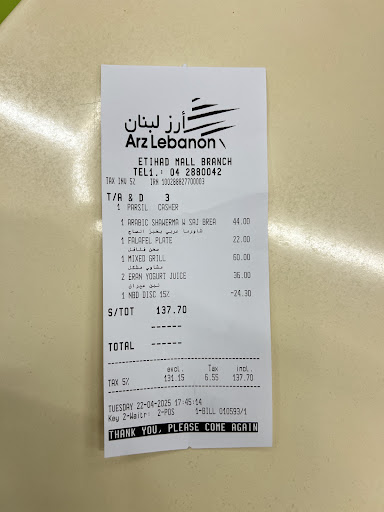 Der Laden Arz Lebanon befindet sich im Food Court der Etihad Mall, aber leider ist das auch schon das Beste daran. Die Preise sind für diesen Standort absolut überzogen – 171 AED für ein paar einfache Gerichte ist einfach zu viel.
