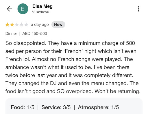 They contacted me on WhatsApp yesterday to give me a call today which they never did. I clearly mention in my comment that I HAVE been there before, so again, if I was willing to return it’s because I LOVED IT before and I really wanted to bring my French friends (which have never been there) to experience it, but they were disappointed too.