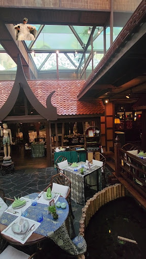 Located on the ground floor (lobby level), this restaurant transports you straight to Thailand with its breathtaking ambience. The moment you step in, you’re greeted by lush greenery, serene ponds filled with colourful fish, and intricate wooden decorations, including a charming bridge over the water.