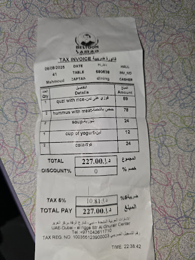 2 hummus with meat (39.39 AED each) 1 koozie (89 AED) 2 Coca-Colas 1 laban They charged us for soups that were always served for free to every guest before ordering. When I questioned it, he said it’s because “you didn’t order enough” and made the comment in a mocking way, as if we were beggars.