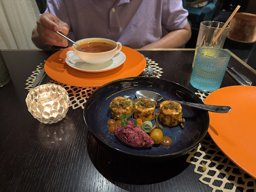 The entire menu needs to be thought of and revamped to justify their lavish price tag and business concept. If you cannot innovate , cannot do fusion properly or cannot think of alternative creative presentation styles/ approaches , at least serve basic normal tasty Indian food like a small restaurant in Bur Dubai or karama. However , the problem is that there is neither innovation nor does the place serve tasty food and that too tops it up with crappy robotic and pretentious service. Just a good ambience with sitar accompaniments is not enough to help maintain that high price tag.