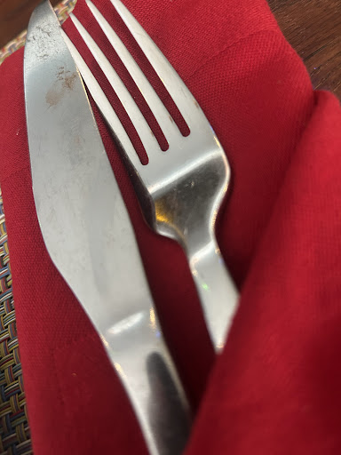 After another 15 minutes, someone comes along and starts placing table mats and cutlery on the table. As seen on the attached picture, my knife was dirty with some stain on it. We had to request a replacement.