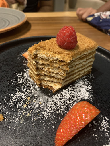 I have no complaints about the kitchen. Tasty. We ordered: •salmon tartare 155drh -2 portions •salmon pelmeni 75drh-1 •beef pelmemi 55drh - •a bottle of white wine Riesling , can't remember something around 400drh • Negroni 75drh -1 •Aperol spritz 70drh -5 •Still water