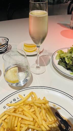 I think the restaurant was understaffed. Laila, our server, was clearly overworked because she had a large number of tables to deal with. The restaurant's interior was quite quiet, and most of the clients were sitting on the terrace. The waiters inside had it easier as a result, but poor Laila had to work hard to meet the needs of her tables. Our own table was 12 people, adding to the challenge. Despite the circumstances, I praise Laila for her unwavering hospitality, sense of humor, and professionalism. Many other servers would have crumbled under such pressure, but Laila remained strong, we were even the last ones to leave the restaurant, well past midnight and she kept her humor till the last second. For starters, we decided to share a few dishes: PoĂȘlĂ©e de Champignons 76AED (9/10). It consisted of sautĂ©ed wild mushrooms in a creamy sauce, served in a freshly baked puff pastry. Then I got the Foie Gras 159AED (10/10). This French delicacy was simply exquisite. It was served with strawberry coulis and toasted pain de figues. The toasted bread alone was delicious. The third starter I tasted that night was the Calamars Frits 83AED (8/10) the calamari was nice but I would have enjoyed a more creative batter. The dipping sauce was delicious. I was so hungry that I completely forgot to capture any pictures of the starters, but I highly recommend trying the Foie Gras. In a previous visit to the JLT branch, I also tasted their delicious Salade de ChĂšvre Chaud which I highly recommend as well. I ordered the Couqley's Steak Frites (10/10) for 139 AED as my main dish, but I upgraded to the larger quantity for an additional 38 AED so that I could have a 280g butterfly-cut tenderloin rather than the standard 180g. It was a fantastic decision, and the Couqleys' signature dish did not disappoint with the tenderloin's flawless cooking and flavorful explosion.