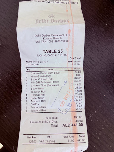 Read moreDelhi Darbar in Karama, located opposite Karama Post Office, is a restaurant that offers a mixed experience. Accessibility is convenient from anywhere in Dubai, with ample parking available in the front and back. The seating facility is good, with a capacity to comfortably accommodate families of up to 10-12 individuals at one table. However, such tables are limited, and other tables can accommodate up to 7 people.