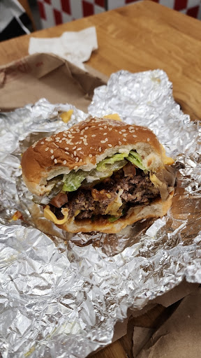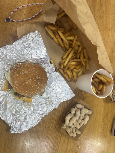 ย ย ย Read morefive guys has always been my go-to for good burgers . however , there were some slight issues at this location . i had a cheeseburger with cajun fries , and i helped myself to the peanuts . burger was huge , and the food had great portions . bottomless drinks were also a nice addition . the burger was juicy , and the cheese and toppings really added to it . however , the burger was a bit messy and oily which is normal , but there was more excess than usual . skin-on fries were crunchy and delicious , but they were not very seasoned compared to other locations . it kind of felt like regular five guys fries . free peanuts were good though ๐ the service is great though , the staff is very kind and the speed of the meal was actually very quick ! kudos to them ๐