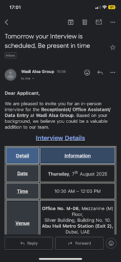 These email are from Scammer I have receive when i went over there cover there face with face with mask. when i went there was lady she offered me high salary .when i asked for the company details dhe said she will mail me every thing then she told me to register myseld for 490 aed. when refuse se got angry and start to insist me to pay i refuse pay they told me go in very rude wy. This is to inform you that your candidature has been shortlisted after the Initial Assessment.