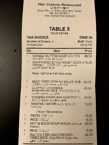 Read moreThe Han at the new Spring souk is an addition to good authentic Chinese food. Cozy and small so better book a table for weekends. Kitchen gets busy so preorder is their advice and ours as well as you may get ur appetizer at the end of your meal. The best for us was their chicken claypot rice.. kids loved it too, and the spicey fried chicken and the noodles. Didnt fancy the wasabi prawns though it's on their top dishes, and the whole fish deep fried.. was a bit too sweet for our taste. Still want to go back for the Cantonese duck so definitely good Chinese food for the Asian...
