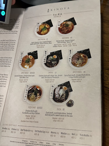 As for the ramen, we had the shio paitan ramen, spicy miso ramen, and the duck ramen. The duck ramen was surprisingly good, especially the side: duck leg in a sweet sauce. It sets Kinoya apart from the competition. The sweet sauce is not just âsweet sauceâ. I feel like it deserves a better name. Itâs an interesting sauce made from duck fat, and it packs an Umami punch. Try mixing some in the ramen âlittle by little throughoutâ (as recommended in the menu) and enjoy your ramen getting more and more delicious! The server said âdo not mix the sauce with the ramenâ without elaboration. You should not mix the ENTIRE sauce as the ramen will get too sweet. That is definitely true. But you can mix a little bit until you get the perfect balance. Believe me, it will make the broth tastes better. I got that tip from the menu. The duck ramen is indeed pricey, but because itâs âSilver Hillâ duck (regarded as one of the best in the world) and theyâre generous with it. The other ramens were great, too. The spicy ramen packs more flavor, but I also really enjoyed the shio ramen. If youâre looking for something non-standard, go for something different from the shio ramen. But you wonât go wrong either way. Other than the broth, I have to say that the noodles itself here is way better than any other ramen noodles I tried in the UAE. This place ramens.