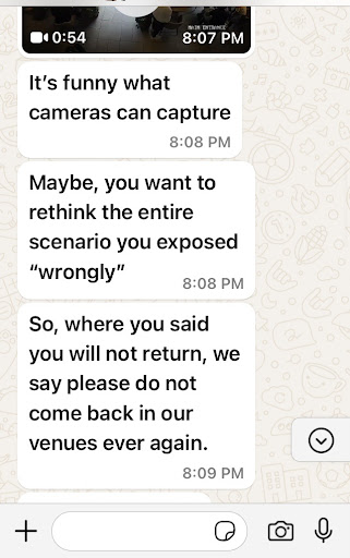 The next day, I left an honest Google review to share my experience and I received a call from the operations manager, who assured me that they would investigate the matter. However, what followed was even more shocking. Shortly late evening I received a threatening message on WhatsApp from the operations manager, claiming that they had a recorded video of me "keeping" my leftover food and threatening to expose me if I did not remove my review?