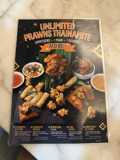 Furthermore, the "Unlimited Prawns Thainamite" appetizer felt misleading. The term "unlimited" suggests you can have more, but I was only asked once what we wanted for the appetizer, and that was it. There was no offer for refills, making it not truly "unlimited" as advertised.