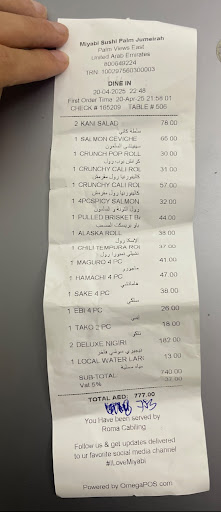 I ordered many things as you can see from the receipt I have attached, one of which was âpick your own sashimiâ which goes for 144AED. You can choose 18 sashimi pieces, so I did and you know what I found out because I read the receipt? THEY TRIED TO CHARGE ME 20% MORE BY BILLING ALL OF THE SASHIMI PIECE INDIVIDUALLY!