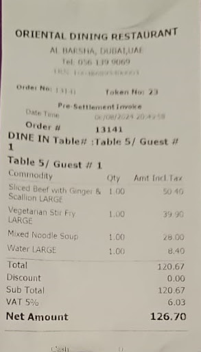 Really disappointed. I don't like posting this review but it's an honest one and unfortunately fully earned by the restaurant. I very much wanted to like this place and was looking forward to going. I don't expect to return again. I ordered Sliced Beef with ginger & scallion sizzler. It was not served on a sizzling flat iron but on a glass plate. You can't call it a sizzler and serve it luke warm plate drowining in sauce. I also ordered a veggie stir fry - I don't know what I ate but that was definitely NOT a stir fry. It was more like an overthickened soup or underdone soup - slop is what I would call it. The veggies were drowning in sauce, overly wilted, over-cooked and far too bland, almost tasteless, lacking any kind of bursting flavor one would expect from Malay and Singaporean cuisines. I also ordered a mixed noodle soup with chicken and prawns. There was one small prawn piece and 3 shreds of chicken in the soup - I made sure to count them when I realized how skimpy it was going to be. OK so if you want to cut costs that's understandable but this is ridiculous. Last point is the VAT is double-charged on your bill. The water bottle I ordered was AED 8 on the menu and showed up as AED 8.40 as a line item before another 5% VAT was added on top of that. The same with all of the other items - 5% tacked on above the menu price then another 5% on the total bill. See the attached picture and compare it to the printed menu rices - you'll see this is an accurate statement of doubling the VAT tax on customers. It's one thing to have a bad experience at a restaurant - we've all had one. It's another thing to rip your customers off with a tax cheat to boot. I wonder what the UAE Tax Authority would have to say about this funny business going on here. I will say the service was great. The Pinoy ladies were awesome - they always do a great job tending to customers. If you want to have a lousy meal and regret the decision, you can go to this restaurant and see...