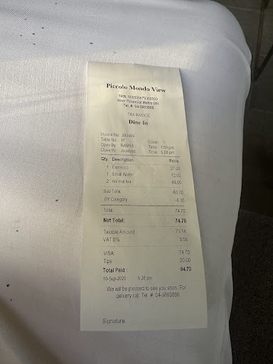 A bad experience. I had my own tea and asked for hot water. They added 44 AED to the bill just for hot water. When I asked, they said it’s the management’s decision. How can hot water be 44 AED? The prices are exaggerated — even water is 12 AED. A very bad experience, and the prices need to be reviewed.