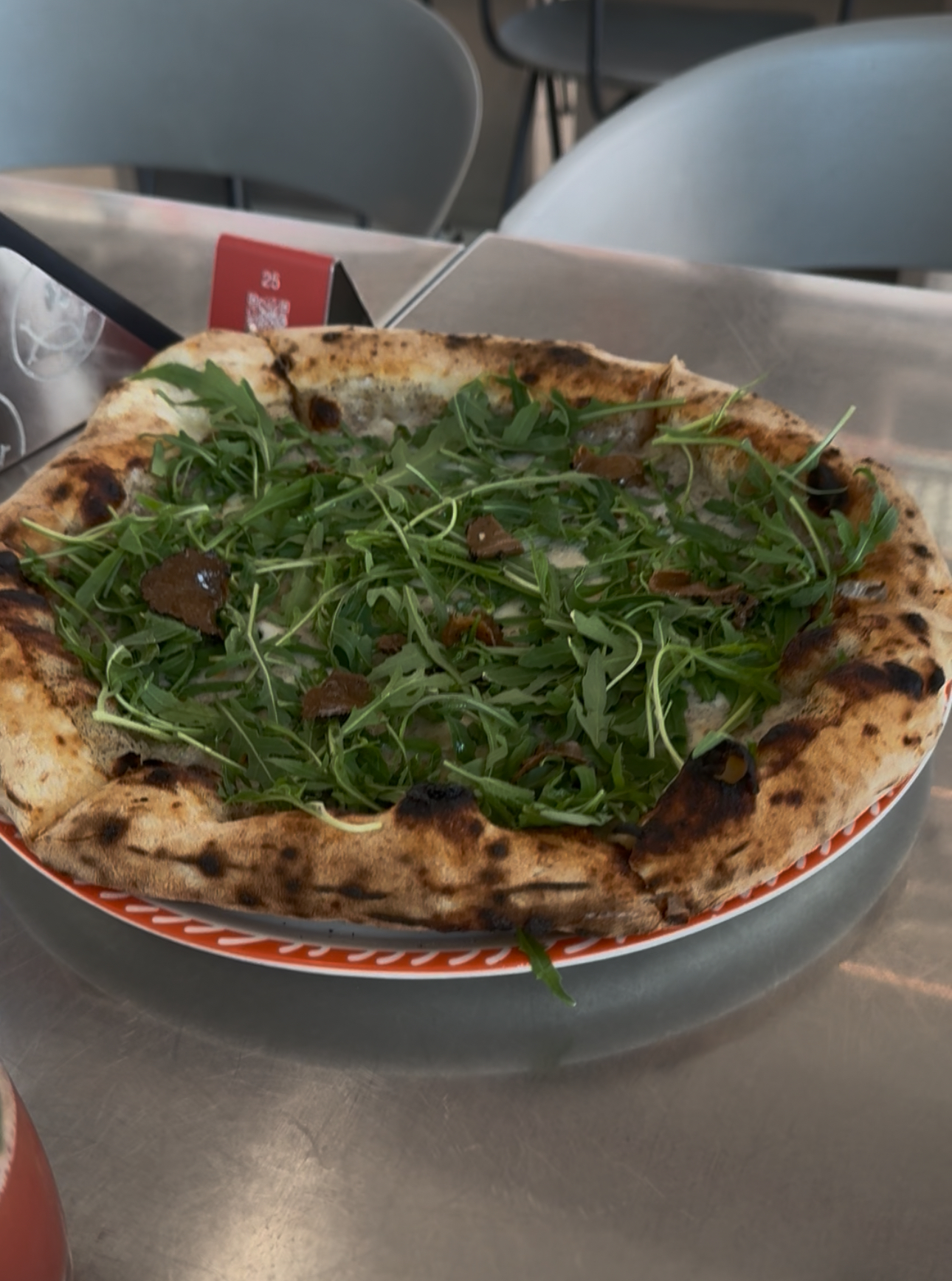 Once we were finally seated at table 8, we were left unattended, without a menu or even a QR code to scan. Only after asking a staff member did we receive a QR code for the menu. I knew I wanted to order a tiramisu and a bottle of sparkling water, so I immediately requested to place my order. Instead of taking it, the staff member told me to wait for a waiter, and so we waited… and waited.