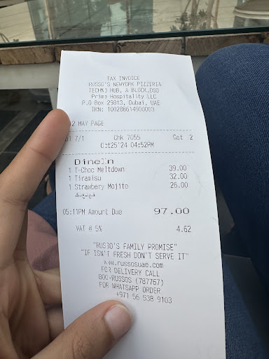 I recently visited Russo's New York Pizzeria, and it was an amazing experience! The sitting arrangements are both indoor and outdoor, and with the lovely weather in Dubai these days, we chose to sit outside. The outdoor ambiance is fantastic, with beautiful décor that adds to the overall dining experience.