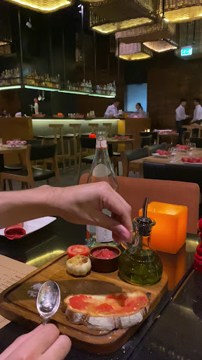 Read moreWent for a business dinner later evening (Wednesday) at this hotel restaurant, not knowing it offers a Spanish cuisine, which I love esp the pa-e-ya (the authentic pronunciation). Going out in the coronavirus era is not easy, with temp check at the hotel entrance and the restaurant. The entrance to the restaurant is not marked so one is directed by a guy in the lobby as "go to the left" but there you see the Spa, then the spa lady says "right there" pointing to the wall abutting the Spa. Finally I get inside, a bit too dark, square baskets hanging from the ceiling all over. I get seated, no menu: a small card to be scanned, but my phone can't scan. My host got the paper menu which lists the items in Spanish with barely any English description!!! Luckily our mâitre was very friendly, brought us (after quite some yime) the "bread basket which has very over-roasted garlic (less than half in thickness), along a bland salsa, a thick slice across the top of a tomato and olive oil, a combo very unusual. He helped us navigate the menu and everything he suggested, we chose: the caramelized goat cheese salad (literally out of this world), the octopus tapa (singular of tapas since they're offered singly) which has broadly sliced two 6-7 cm pieces of the octopus legs over mashed potato (very delicious) and of course the Lobster Pa-e-ya. The lobsters (2) seemed whole and big but the tail meat was tinier than expected (pictured), somehow very tender (almost spreadable) and not chewy, but delicious. One drawback was that it's vein was not cleaned, and I knew it was not the chef who prepared it, the mâitre apologized about it and said the chef was off. Comes the dessert, as suggested we had the cream Catalana (made with cinnamon, totally different from the famous creme brûlée) and the icecream. A star nowhere else tasted/offered: 3 rather small choc orange (2) and almond (1) flavors, but heavenly. Except for the few missed things, it was a memorable dinner. The salla was packed by the time I...