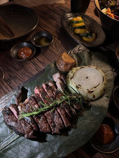 The culinary journey at Smoki Moto begins with state-of-the-art charcoal grills embedded in each dining table, allowing guests to engage in an interactive barbecue experience. Signature dishes include various cuts of beef, such as the chuck flat tail, Galbi, dry-aged kelp rib-eye, and butter-aged striploin, each prepared with meticulous attention to detail. Accompaniments like homemade fermented kimchi, lotus root, and bean sprouts complement the rich flavors of the meats, while the kimchi bibimbap offers a harmonious blend of crispy rice and spicy-sour tang.