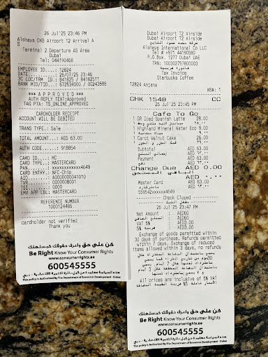 Today I visited the Starbucks at Terminal 2, Dubai International Airport, and ordered a Spanish Latte, carrot cake, and a bottle of water. I was planning to sit and enjoy my order, but was told that the dining area was closed for cleaning â even though the store was open and serving customers.