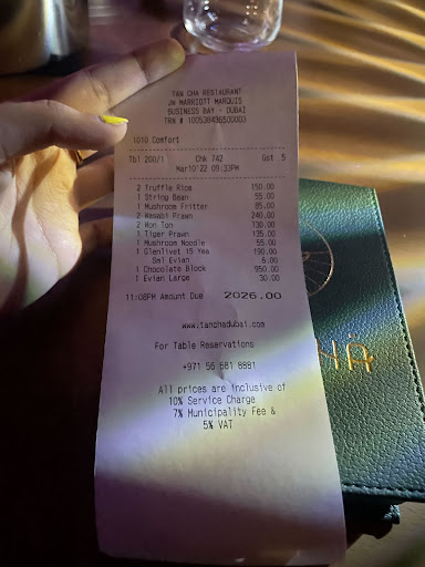 I would NEVER visit this restaurant again. My dad made a reservation for my birthday and we visited Tan Cha on March 10. My family was excited to bring in my birthday with a good meal and pleasant ambience. We left with utmost dissatisfaction and disappointment. Our server was extremely slow and rude. The wine list doesn't provide details on price of bottles. The waitress simply said these are the wines we have by the glass and you can order a bottle of the same. She brought us a glass of red wine to dry which was extremely dry and we weren't too happy with it. The manager then came to us to suggest a bottle and returned with two bottles in hand. He mentioned to us a bottle is priced at AED 400 which is quite cost effective and I selected a bottle named Chocolate Block as I have a couple of them at home and it costed me AED 150 from Dubai Duty Free. The starters were literally bite sized portions so we were forced to order two portions of everything as we are a family of 5. To our dismay, the mains arrived one after the other with an extremely significant gap between each. First, we received truffle rice which was in a tiny bowl. The prawn dish we ordered arrived 20 minutes later and it contained only 4 pieces. After trying it, we realised it wasn't the right dish that we ordered and waited another 20 minutes to receive the right dish. As we were starving, we ordered another serving of rice and everything took forever to arrive. We requested the waitress if the chef could prepare the same prawn dish in chicken as the menu didn't have many chicken options. Her response was we're too busy today and you'd need to wait 20 minutes if you would like us to prepare this dish with chicken. We were speechless. Too busy?? Another manager came to us to apologise however it didn't change the level of service we were receiving. She mentioned to me our restaurant is quite reasonably priced but if you see our bill (attached for reference), you'd go home with a happy belly and smile on your face after spending that amount at say Tong Thai which is in the same hotel or even Zuma for that matter. At Tan Cha, you can count the pieces on your plate - that's how stingy they are with their portions. Towards the end of our meal, the manager came to me again and offered for us to select 3 desserts on the house. I politely asked her how long it would take for them to arrive considering our entire meal took an extremely long time to arrive on the table. She said I would need another 15-20 minutes as we are quite busy. I told her we had to be home soon so please check and get back. Considering my father had already requested for a dessert when he made the reservation, they should've been prepared. 15 minutes passed by and no desserts appeared on the table. We were extremely frustrated and asked the waiter where are the desserts. She said you told my manager you'll had to leave so we didn't prepare any. My father looked at her completely awestruck and simply asked for the bill. When the bill arrived, my heart sank. There were no discounts on the bill considering the manager kept apologising for the horrible service and experience we had. The bottle of wine on the bill appeared as AED 950. This is literally exploitation!!! Poor hospitality, terrible service, bite-sized portions, extremely pricey - I would NEVER recommend this restaurant to anyone. Frankly speaking, I told the Manager to her face you'd be known as a lounge and definitely won't survive as a restaurant. And I stand by that statement. Not...