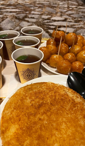 The Karama one, where we got in, was a two-storied restaurant on the roadside with options to enjoy separate family diners as well. It was lunch time and hence we took a platter combining of Green salad, Raw Hot Chicken Soup, Chicken Mandi and then Kunafa and Sweet Balls as dessert. I find their chicken soup completely different (both in colour and taste) compared to one we’re normally acquainted with in India. This soup is light with no added spice except salt and smells raw meat. Also once you finish off this soup, you feel tremendous hungry. So, Chicken Mandi is an apt choice under the circumstances.