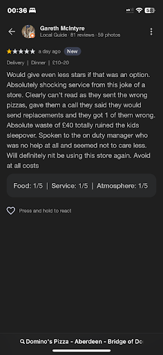 Order placed at 18.10 on Friday Oct 3rd, app said the pizzas were delivered not true, called the store and they apologised because it was busy, they said it will be here soon, half an hour later no pizzas, phoned again and the guy on the phone said oh you havenāt received your order? No we havenāt, he said it will be here in 5 minutes WRONG again, this was half past seven one of the members of the house hold went ballistic. Order came at 19.50 pizzas & chicken where cold, they gave us an extra Texan bbq, no dips either we think we received someone elseās pizza probably Garethās order. Emailed Dominos with a complaint, manager got back to me offering a free large pizza?! A refund would of been...