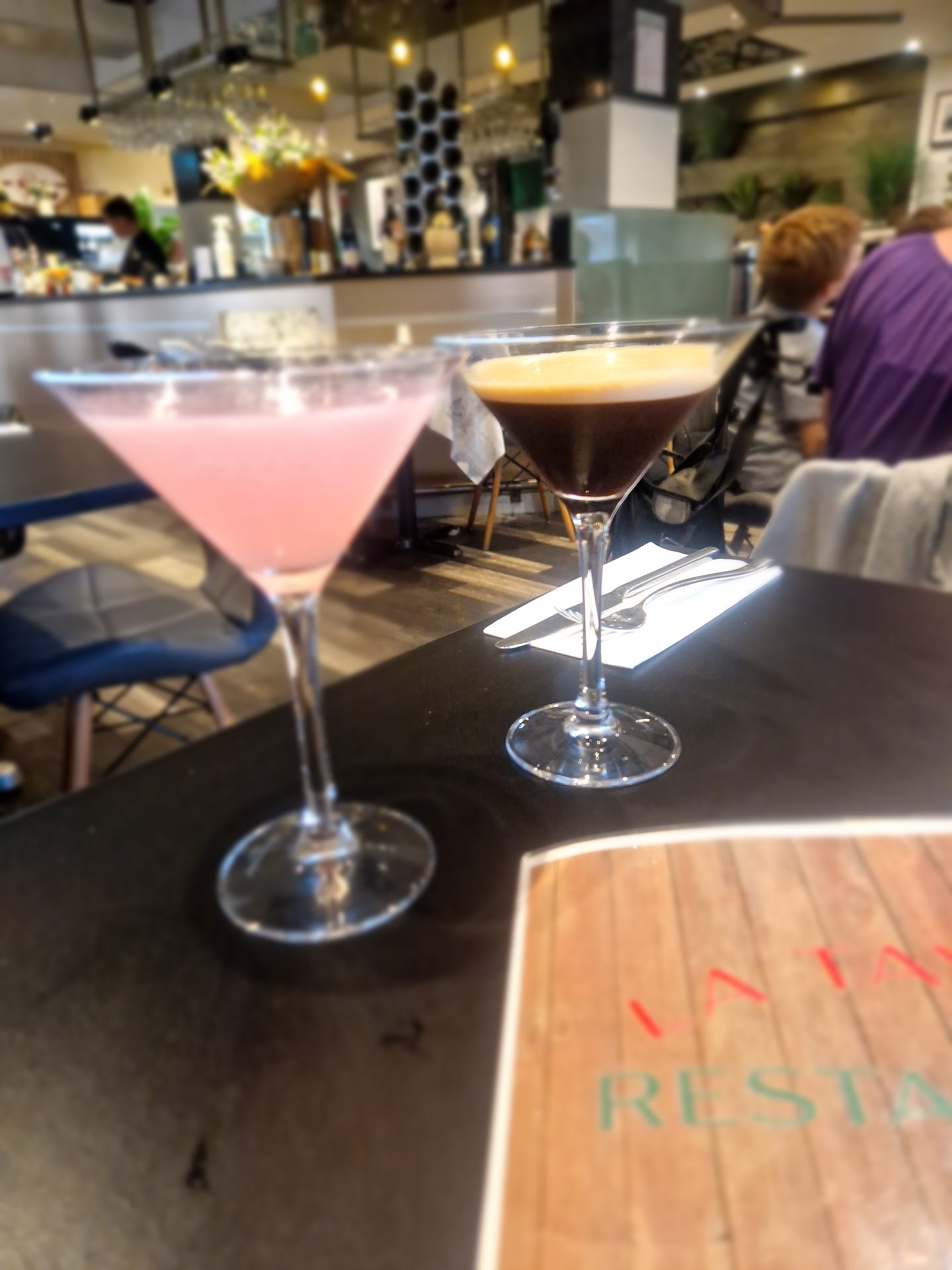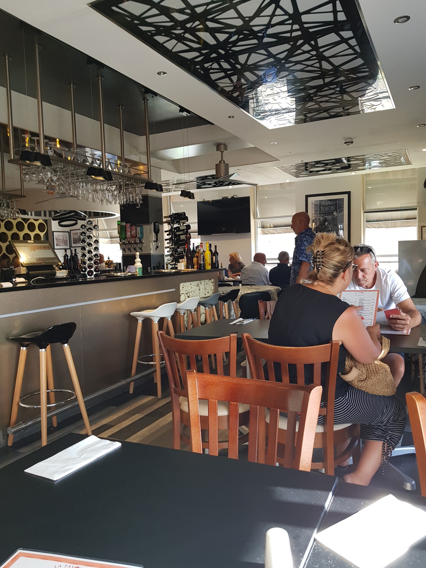 We had a meal for two, 'date night' at 'La Tavola' last night. When we arrived, we were greeted in a friendly manner by the Italian waitress; she took us through the bustling restaurant to our table. It was a busy Saturday night, and the atmosphere was great - buzzing, happy, and a true authentic italian style. We were given a good amount of time to read over the drinks menu - not too long - but not rushed. Our waitress knew the cocktails that were available for the evening. They aren't listed on the menu as they are 'drinks specials'. We chose an Espresso Martini and Cosmopolitan to start the evening whilst we chose our food. The menu is full of classic / typical Italian choices, and they offer a fair range of vegan and vegetarian options, gluten free choice could be better. We opted for the garlic mushrooms and capresse salad for starters and vegano La Tavola pizza for main. The Mushrooms were 5*, they were in a very tasty creamy, garlicky, white wine and parsly sauce. The quantity was perfect for a starter, and it was presented nicely. The Capresse salad was also delicious. The amount of mozzarella, tomato, and basil was well balanced and very tasty. Presentation had been carefully arranged around the plate in a typical Italian style. Our waitress noticed quickly when we had finished and cleared our plates away. We ordered some wine that was promptly brought to the table, offering for us to taste before fully pouring. The waitress was friendly and engaged in a conversation about the restaurant and its background and about the menu. This, we felt, showed very good service, given how busy the restaurant was; she didn't make us feel rushed or that she was too busy for conversation. Our pizzas arrived, and the slight adjustments to the order had been carried out so that our pizza was perfect and as ordered. The pizza was delicious, quite moist, and better / easier to eat with a knife and fork, so if you prefer your pizza less moist- I would suggest this is expressed when ordering. For dessert, we opted for the vegan cheescake- a very tasty, creamy vanilla cheesecake with a crunchy biscuit base. A real treat. Overall, the whole evening was a very pleasant evening, we left happy, full and satisfied. The service was brilliant, the food was delicious and the atmosphere was buzzing. The only criticism would be the cushioned bench seats we sat on were damaged. Probably from cleaning, I imagine. It would be very inexpensive to cover this temporarily until it is fixed properly and it was a shame to have it like this for customers. There were also a couple of missing ceiling panels. These small issues impacting the overall classic and modern aesthetics of the restaurant.